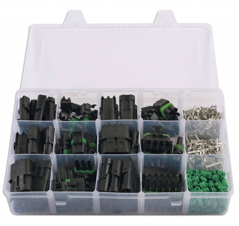 • Delphi vízálló csatlakozó készlet 426 darabos kiszerelésben: tűhegyek, gumitömítések, műanyag "apa-anya" házas csatlakozók.