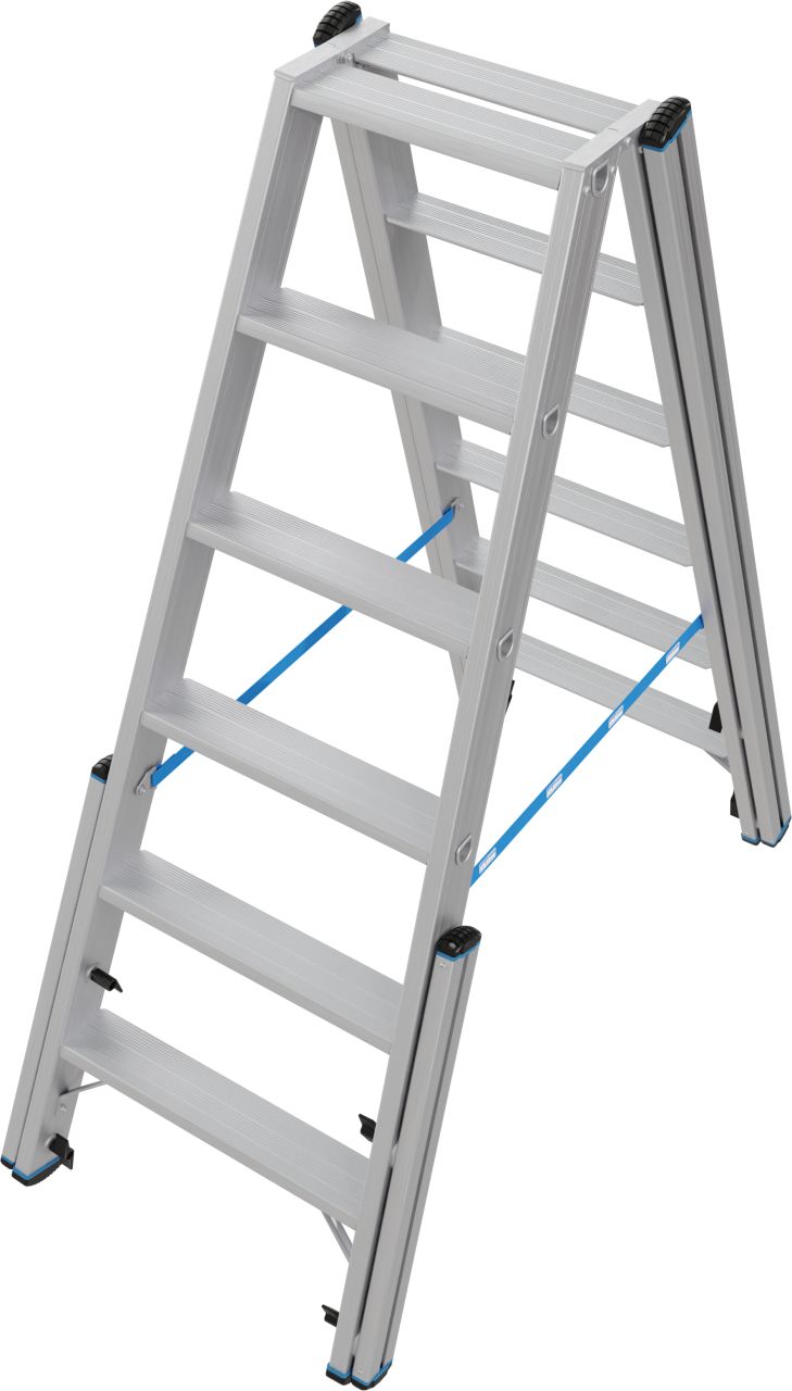 Ez a professzionális használatra kifejlesztett alumínium teleszkópos két oldalon járható létra lépcsőfunkcióval nagy stabilitást biztosít még lépcsőkön, sarkokban, emelvényeken és hasonló magasságkülönbségek esetén történő használat során is.