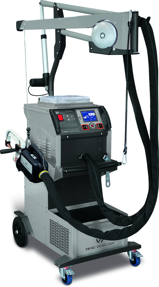 A VAS 821 101A processzor vezérelt, többfunkciós ellenállás-hegesztő transzformátorral és G-rögzítő karral minden olyan javító ponthegesztéshez alkalmas, amely a Volkswagen Csoport járművein megengedett magas- és ultra-magas szilárdságú acéllemezeken, valamint hőkezelt acéllemezeken (UHSS / bóracél). Az eszköz maximális elektróda-kapcsolási nyomása 550 daN 8 bar nyomáson, és hegesztési teljesítménye akár 14 500 amper is lehet. Az olyan zavaró tényezők, mint a festékmaradványok, üregek stb., automatikusan felismerésre kerülnek, és ha lehetséges, adaptívan kerülnek kezelésre. Ha a vezérlési toleranciák túllépésre kerülnek, a készülék kijelzőjén szöveges üzenet jelenik meg. A teljes folyamatfigyelés és a nyomás, hegesztési áram vagy hegesztési hőmérséklet automatikus vezérlése szoftver segítségével lehetséges. Az energia garantálja a folyamatosan magas minőségű hegesztéseket.